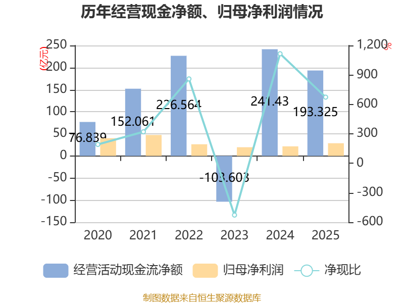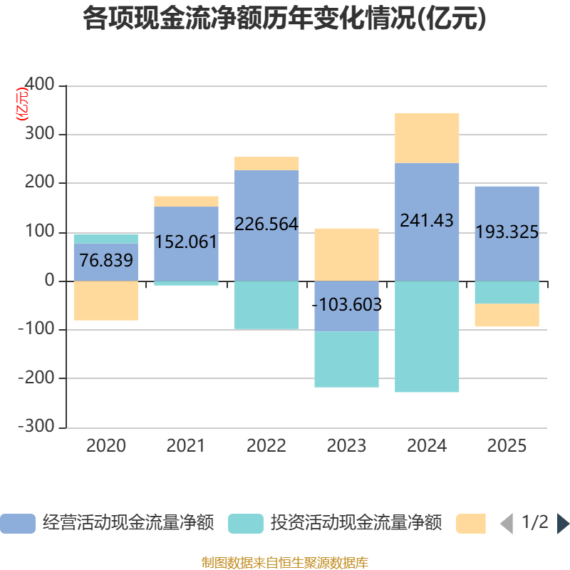 畛域2025年,公司筹画四肢现款流净额为193.32亿元,同比下落19.93%;筹资四肢现款流净额-46.51亿元,同比减少148.4亿元;投资四肢现款流净额-46.64亿元,上年同时为-227.69亿元。