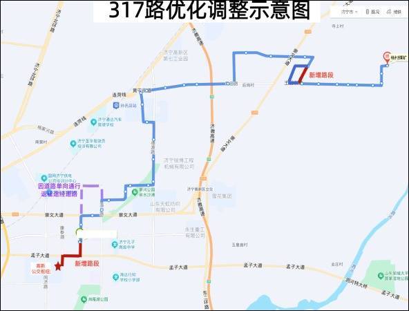 317路:高新公交关节发车,沿康泰路向北至孟子大路,沿孟子大路向东至高新大路,沿高新大路向北插足原清亮运营至济微路,沿济微路向南至黄王路插足原线运营至绝顶站。调遣后取销:王因公交首末站共1站;新增:东说念主民病院东院区东、东说念主民病院东院区、高新公交关节、济微路黄王路共4站。