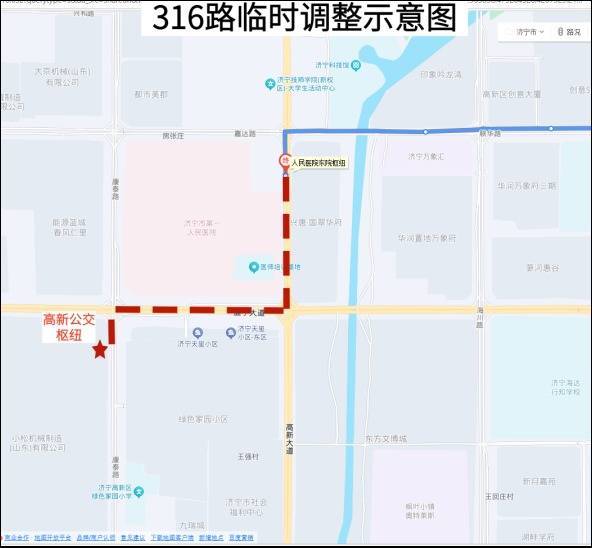 316路(临时调遣):临时调遣至高新公交关节发车,沿康泰路向北至孟子大路,沿孟子大路向东至高新大路,沿高新大路向北插足原清亮运营至绝顶站。临时停泊:东说念主民病院东院区东、东说念主民病院东院区、高新公交关节共3站。